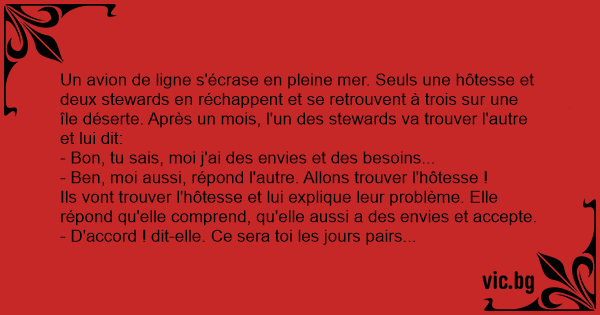 Un avion de ligne s'écrase en pleine mer. Seuls une hôtesse et deux stewards en réchappent et se retrouvent à trois sur une île déserte. Après un mois, l'un des stewards va trouver l'autre et lui dit: