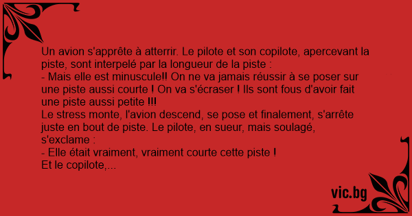 Un avion s'apprête à atterrir. Le pilote et son copilote, apercevant la piste, sont interpelé par la longueur de la piste :