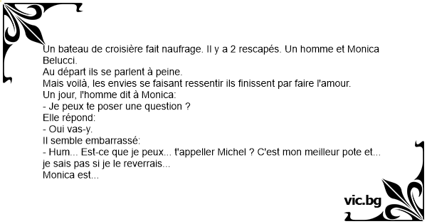 Un bateau de croisière fait naufrage. Il y a 2 rescapés. Un homme et Monica Belucci.