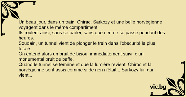 Lors d'un voyage d'affaire Chirac et Sarkozy se retrouve dans le même compartiment du train en compagnie d'une superbe blonde et d'une nonne. Le train s'engage dans un tunnel, et le compartiment...