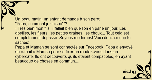 Papa et Maman se sont connectés sur Facebook. Papa a envoyé un e-mail à Maman pour se fixer un rendez-vous dans un cybercafé. Ils ont découverts qu'ils étaient compatibles, en ayant beaucoup de choses en commun. Papa et Maman ont décidé alors faire un partage de fichiers. Ils se sont dissimulés dans les toilettes, et Papa a introduit sa clé USB dans le port USB de Maman. Lorsque Papa fut prêt pour le téléchargement, Papa et Maman réalisèrent qu'ils n'avaient pas mis de Pare-Feu. Hélas, il était trop таrd pour annuler le transfert et il était impossible d'effacer les données.