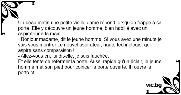 Un beau matin une petite vieille dame répond lorsqu'on frappe à sa porte. Elle y découvre un jeune homme, bien habillé avec un aspirateur à la main.
