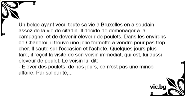 Un belge ayant vécu toute sa vie à Bruxelles en a soudain assez de la vie de citadin. Il décide de déménager à la campagne, et de devenir éleveur de poulets. Dans les environs de Charleroi, il trouve une jolie fermette à vendre pour pas trop cher. Il saute sur l'occasion et l'achète. Quelques jours plus таrd, il reçoit la visite de son voisin immédiat, qui est, lui aussi éleveur de poulet. Le voisin lui dit: