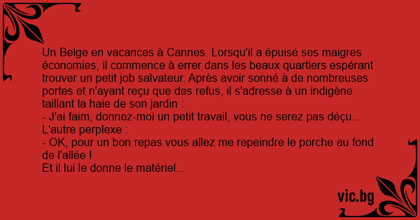 Un Belge en vacances à Cannes. Lorsqu'il a épuisé ses maigres économies, il commence à errer dans les beaux quartiers espérant trouver un petit job salvateur. Après avoir sonné à de nombreuses portes et n'ayant reçu que des refus, il s'adresse à un indigène taillant la haie de son jardin :