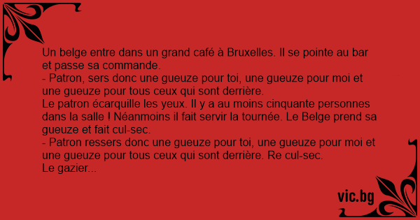 Le patron écarquille les yeux. Il y a au moins cinquante personnes dans la salle ! Néanmoins il fait servir la tournée. Le Belge prend sa gueuze et fait cul-sec.