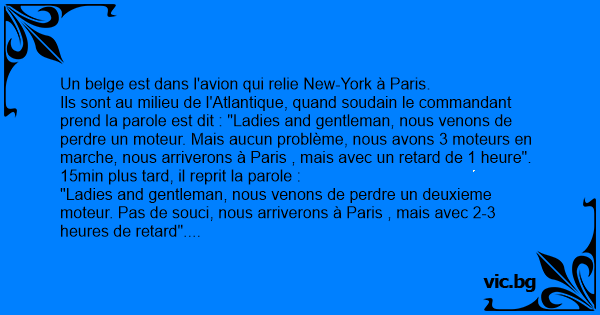 Ils sont au milieu de l'Atlantique, quand soudain le commandant prend la parole est dit : "Ladies and gentleman, nous venons de perdre un moteur. Mais aucun problème, nous avons 3 moteurs en marche, nous arriverons à Paris , mais avec un rетаrd de 1 heure".