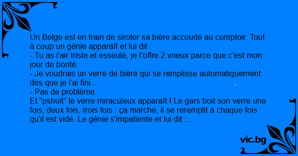 Un Belge est en train de siroter sa bière accoudé au comptoir. Tout à coup un génie apparaît et lui dit :