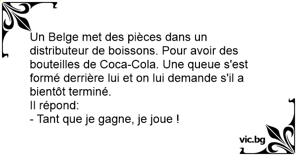 C'est un Belge qui marche dans la rue. Il passe devant un distributeur de boissons et s'arrête, stupéfait. "Tiens, alors comme c'est bizarre, à quoi ça peut bien servir ??" Il fout une pièce,...