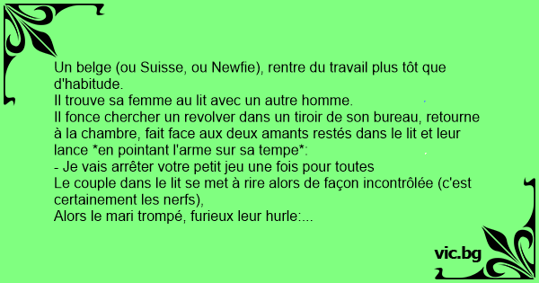 Un belge (ou Suisse, ou Nеwfiе), rentre du travail plus tôt que d'habitude.