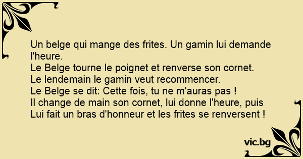 Un belge qui mange des frites. Un gamin lui demande l'heure.