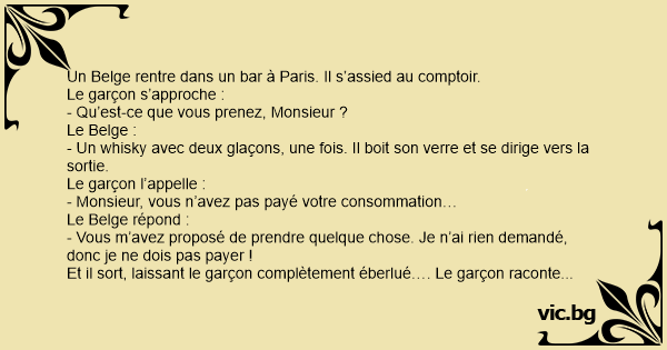 Le patron reconnaît l’accent et lui sert son verre. Après avoir bu, le Belge s’en va sans payer. Le patron lui dit :