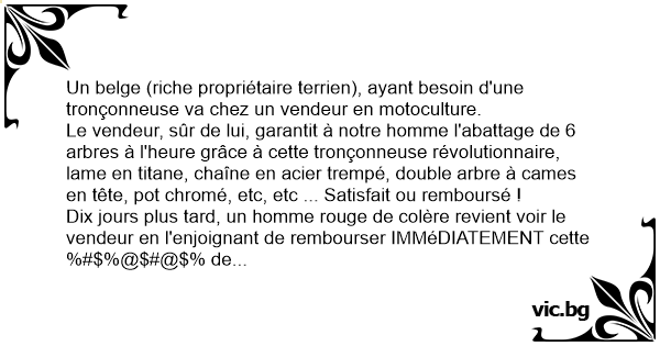 Un belge (riche propriétaire terrien), ayant besoin d'une tronçonneuse va chez un vendeur en motoculture.