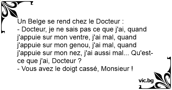 Chez le docteur, un homme appuie avec son doigt aux endroits où il a mal: - Là ... Aïe, c est horrible! Là ... Ouill, c est affreux! Et là ... Aïe, Ouille, c est pire! Mais qu'est ce que j'ai,...