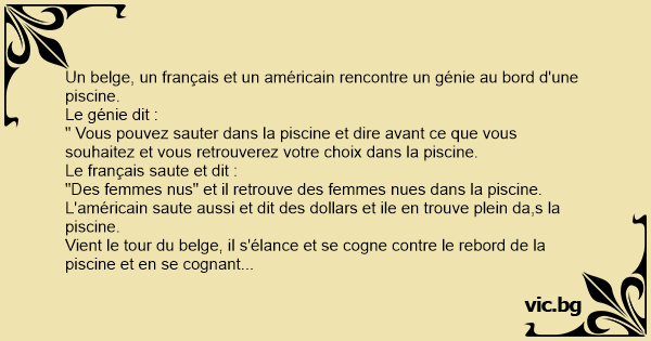 Un belge, un français et un américain rencontre un génie au bord d'une piscine.