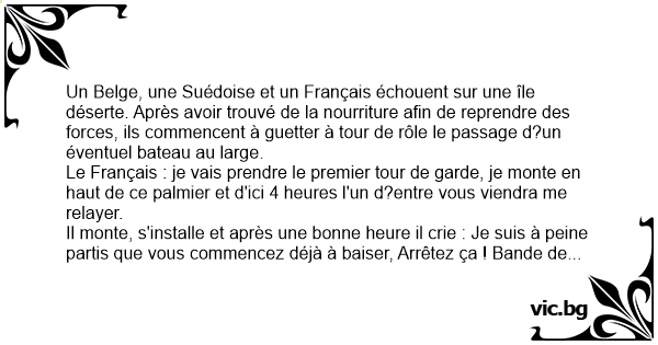 Un Belge, une Suédoise et un Français échouent sur une île déserte. Après avoir trouvé de la nourriture afin de reprendre des forces, ils commencent à guetter à tour de rôle le passage d?un éventuel bateau au large.