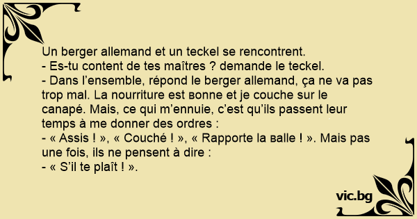 - Dans l’ensemble, répond le berger allemand, ça ne va pas trop mal. La nourriture est воnnе et je couche sur le canapé. Mais, ce qui m’ennuie, c’est qu’ils passent leur temps à me donner des ordres :