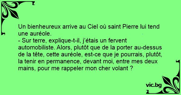 - Sur terre, explique-t-il, j’étais un fervent automobiliste. Alors, plutôt que de la porter au-dessus de la tête, cette auréole, est-ce que je pourrais, plutôt, la tenir en permanence, devant moi, entre mes deux mains, pour me rappeler mon cher volant ?
