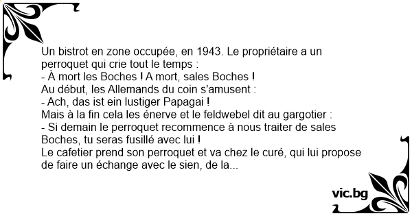 - Si demain le perroquet recommence à nous traiter de sales Boches, tu seras fusillé avec lui !