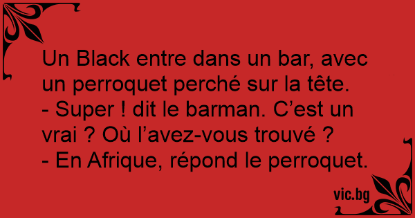 Un Black entre dans un bar, avec un perroquet perché sur la tête.