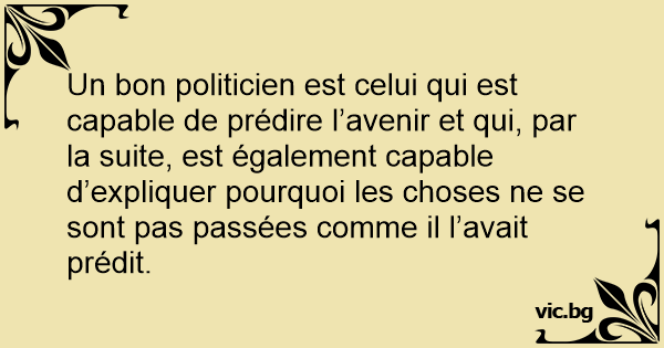 Un bon politicien est celui qui est capable de prédire l’avenir et qui, par la suite, est également capable d’expliquer pourquoi les choses ne se sont pas passées comme il l’avait prédit.