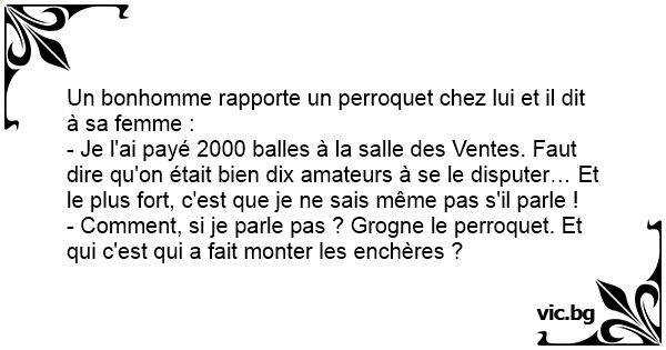 Un bonhomme rapporte un perroquet chez lui et il dit à sa femme : - Je l'ai payé 2000 balles à la salle des Ventes. Faut dire qu'on était bien dix amateurs à se le disputer… Et le plus fort, c'est que je ne sais même pas s'il parle ! - Comment, si je parle pas ? Grogne le perroquet. Et qui c'est qui a fait monter les enchères ?