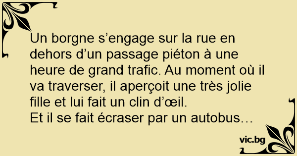 Un borgne s’engage sur la rue en dehors d’un passage piéton à une heure de grand trafic. Au moment où il va traverser, il aperçoit une très jolie fille et lui fait un clin d’œil.