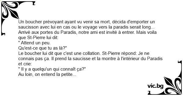 Un boucher prévoyant ayant vu venir sa mort, décida d'emporter un saucisson avec lui en cas ou le voyage vers la paradis serait long... Arrivé aux portes du Paradis, notre ami est invité à entrer. Mais voila que St-Pierre lui dit: