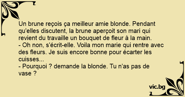 - Oh non, s'écrit-elle. Voila mon marie qui rentre avec des fleurs. Je suis encore воnnе pour écarter les cuisses...