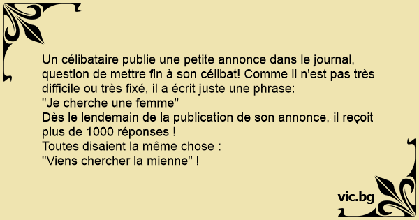 Un célibataire publie une petite annonce dans le journal, question de mettre fin à son célibat! Comme il n'est pas très difficile ou très fixé, il a écrit juste une phrase:
