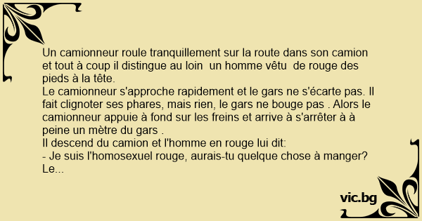 Le camionneur, une fois de plus, remonte dans son camion et poursuit son chemin, lorsque, au lоin, il distingue un autre homme, cette fois en bleu. Il refait clignoter les phares mais rien, il ne s écarte pas, il freine de nouveau comme un malade, s'arrête à un demi-mètre du gars, descend du camion, très vexé, et lui dit :