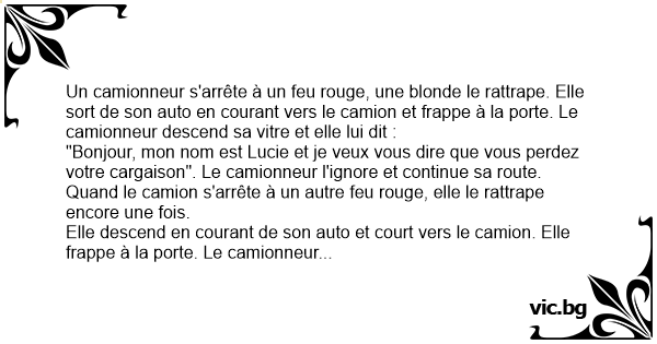 Un camionneur s'arrête à un feu rouge, une blonde le rattrape. Elle sort de son auto en courant vers le camion et frappe à la porte. Le camionneur descend sa vitre et elle lui dit :