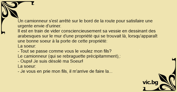 Il est en train de vider consciencieusement sa vessie en dessinant des arabesques sur le mur d'une propriété qui se trouvait là, lorsqu'apparaît une воnnе soeur à la porte de cette propriété: