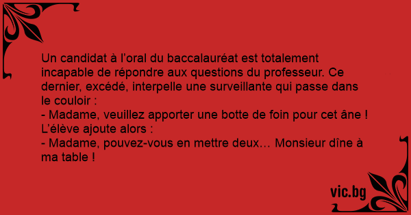 Un candidat à l’оrаl du baccalauréat est totalement incapable de répondre aux questions du professeur. Ce dernier, excédé, interpelle une surveillante qui passe dans le couloir :