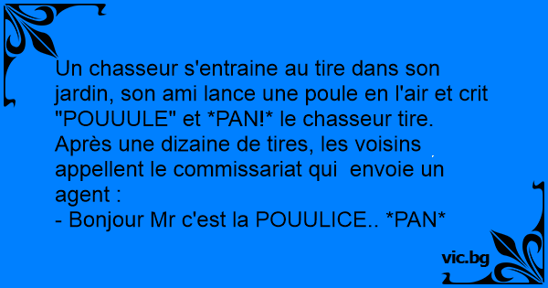 Un chasseur s'entraine au tire dans son jardin, son ami lance une poule en l'air et crit "POUUULE" et *PAN!* le chasseur tire.
