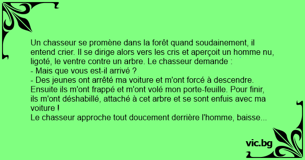 Un chasseur se promène dans la forêt quand soudainement, il entend crier. Il se dirige alors vers les cris et aperçoit un homme nu, ligoté, le ventre contre un arbre. Le chasseur demande :