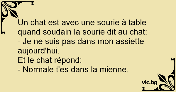 Un chat est avec une sourie à table quand soudain la sourie dit au chat:
