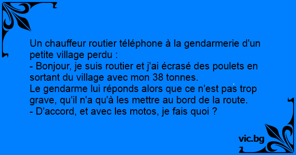 - Bonjour, je suis routier et j'ai écrasé des poulets en sortant du village avec mon 38 tonnes.