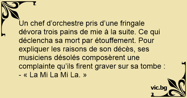 Un chef d’orchestre pris d’une fringale dévora trois pains de mie à la suite. Ce qui déclencha sa mort par étouffement. Pour expliquer les raisons de son décès, ses musiciens désolés composèrent une complainte qu’ils firent graver sur sa tombe :