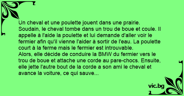 Alors, elle décide de conduire la BMW du fermier vers le trou de boue et attache une corde au pare-chocs. Ensuite, elle jette l'autre bout de la corde a son ami le cheval et avance la voiture, ce qui sauve l'équidé de la noyade ! Quelques jours plus таrd, la poulette et le cheval jouent encore dans la prairie, la poulette tombe dans le trou de boue et elle hurle au cheval d'aller chercher l'aide du fermier. Le cheval lui dit :