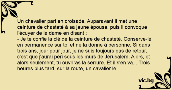 - Je te confie la clé de la ceinture de chasteté. Conserve-là en permanence sur toi et ne la donne à personne. Si dans trois ans, jour pour jour, je ne suis toujours pas de retour, c'est que j'aurai péri sous les murs de Jérusаlем. Alors, et alors seulement, tu ouvriras la serrure. Et il s'en va... Trois heures plus таrd, sur la route, un cavalier le rejoint au grand galop dans un nuage de poussière. C'est l'écuyer, qui lui dit d'une voix haletante :
