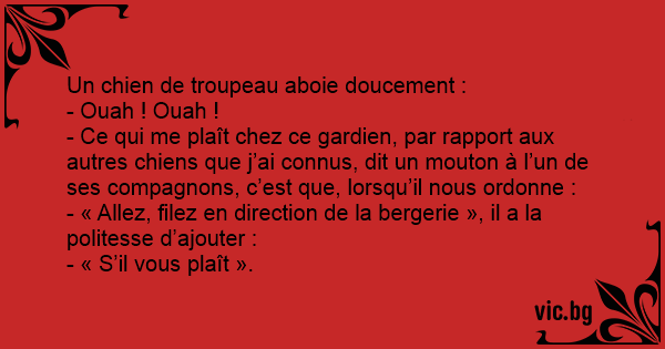 - Ce qui me plaît chez ce gardien, par rapport aux autres chiens que j’ai connus, dit un mouton à l’un de ses compagnons, c’est que, lorsqu’il nous ordonne :