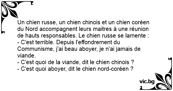 Un chien russe, un chien chinois et un chien coréen du Nord accompagnent leurs maitres à une réunion de hauts responsables. Le chien russe se lamente :
