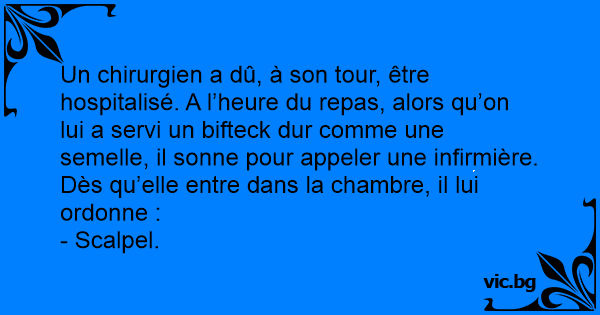 Un chirurgien a dû, à son tour, être hospitalisé. A l’heure du repas, alors qu’on lui a servi un bifteck dur comme une semelle, il sonne pour appeler une infirmière. Dès qu’elle entre dans la chambre, il lui ordonne :