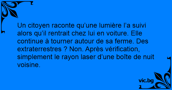 Un citoyen raconte qu’une lumière l’a suivi alors qu’il rentrait chez lui en voiture. Elle continue à tourner autour de sa ferme. Des extraterrestres ? Non. Après vérification, simplement le rayon laser d’une boîte de nuit voisine.