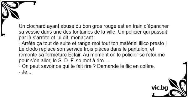 Un clochard ayant abusé du bon gros rouge est en train d’épancher sa vessie dans une des fontaines de la ville. Un policier qui passait par là s’arrête et lui dit, menaçant :