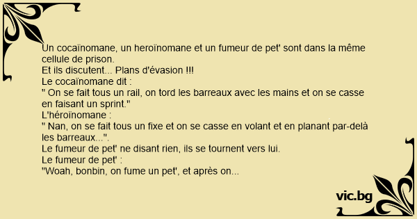 Un cocaïnomane, un heroïnomane et un fumeur de pet' sont dans la même cellule de prison.