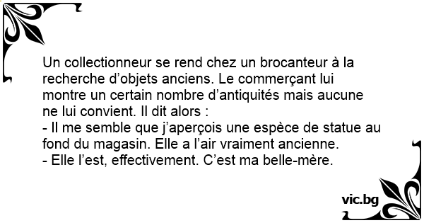 Un collectionneur se rend chez un brocanteur à la recherche d’objets anciens. Le commerçant lui montre un certain nombre d’antiquités mais aucune ne lui convient. Il dit alors :