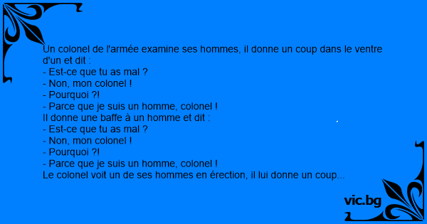 Le colonel voit un de ses hommes en érection, il lui donne un coup dans sa bite et dit :