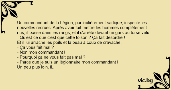 Un commandant de la Légion, particulièrement sadique, inspecte les nouvelles recrues. Après avoir fait mettre les hommes complètement nus, il passe dans les rangs, et il s'arrête devant un gars au torse velu :