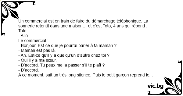 Un commercial est en train de faire du démarchage téléphonique. La sonnerie retentit dans une maison… et c’est Toto, 4 ans qui répond :